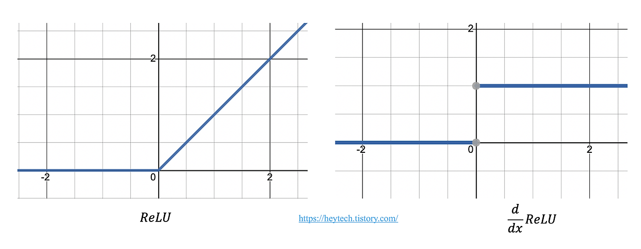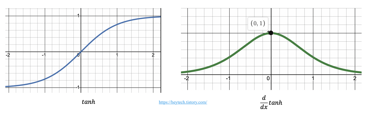 이번에도 오른쪽 도함수 그래프를 보면 sigmoid함수와 비슷하지만 gradient의 최대값이 1이 되면서 vanishing gradient 문제를 완화할 수 있다는 걸 확인할 수 있다. 하지만 하이퍼볼릭 탄젠트 함수 역시 여전히 학습이 느리고, 층이 많아질수록 gradient는 줄어든다는 단점이 존재한다.
