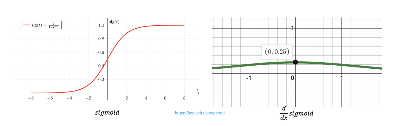 오른쪽 도함수 그래프를 보면 Sigmoid함수의 가장 큰 gradient는 0.25인 것을 확인할 수 있다.
