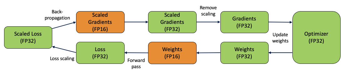 일반적으로는 Gradient를 계산한 후에 스케일링 팩터(Scale factor)를 곱해서 Gradient를 조정한 후 가중치를 업데이트하는 과정으로 오버플로우, 언더플로우를 방지해준다.