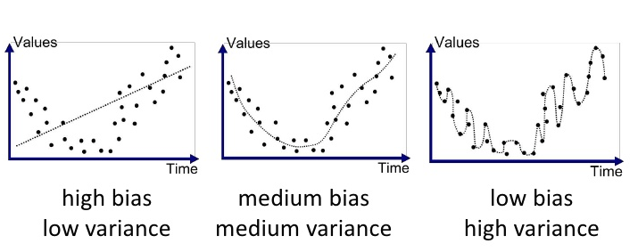 아래 그림을 통해 살펴보자면, 가장 왼쪽 단순한 모델에서는 예측 값과 정답 값의 차이가 크기 때문에 편향이 크고,