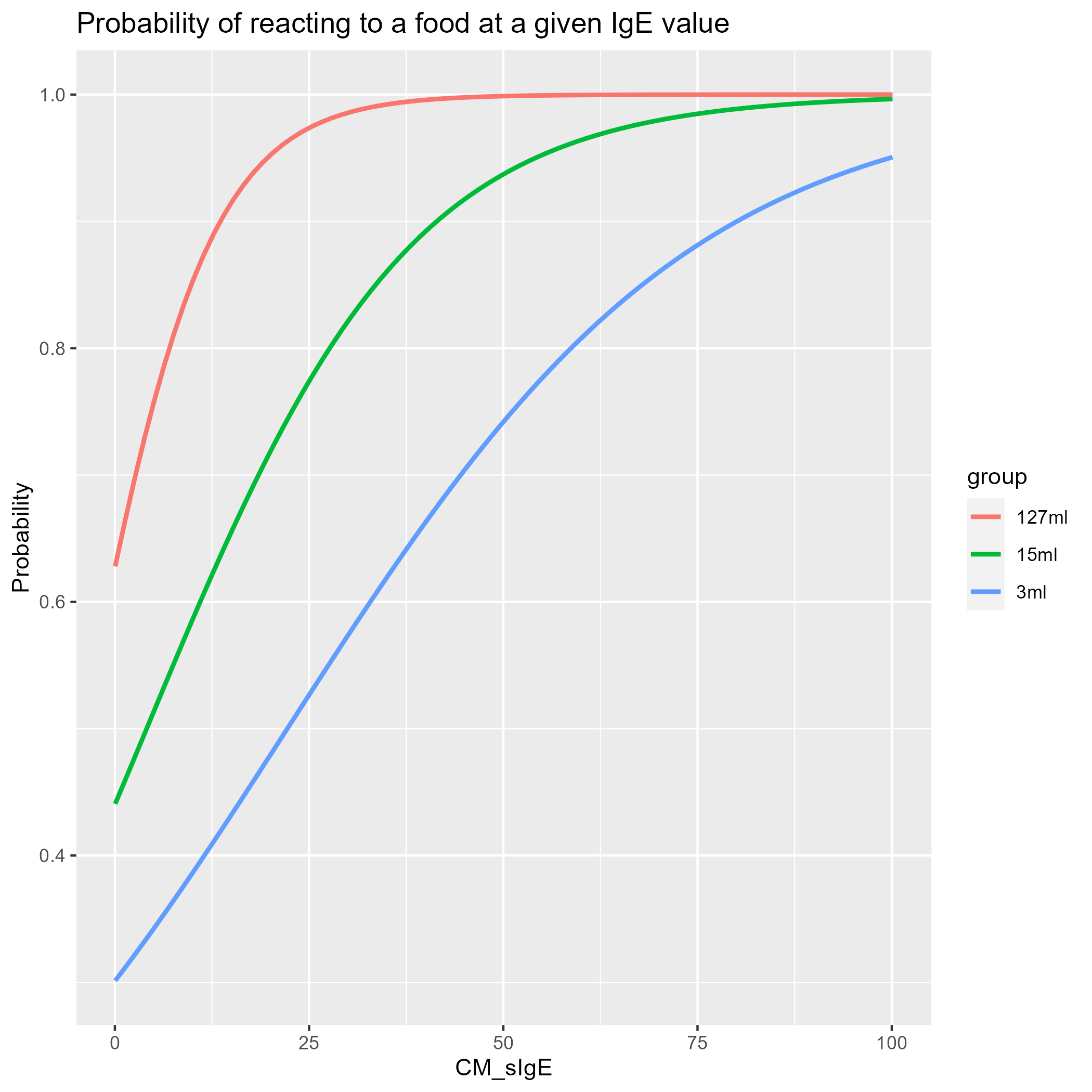 아래는 3개 그룹에서 CM_sIgE의 투여량에 따라 food 알러지가 발생할 확률을 그래프로 나타내는 코드이다.
