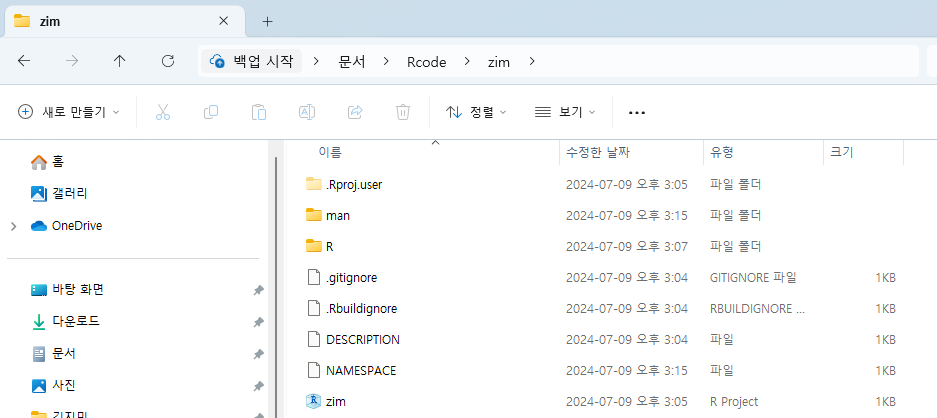 위 코드를 실행하면 지정된 경로에 폴더(나는 이름을 zim으로 생성)가 생성되고 안에 DESCRIPTION, NAMESPACE 등 패키지 메타데이터도 함께 생성된 것을 확인할 수 있다.