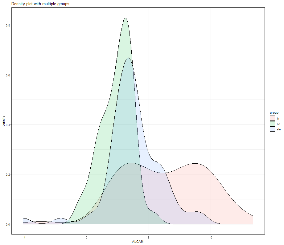 geom_density(alpha = 0.15)+labs(title = "Density plot with multiple groups")+theme_bw()