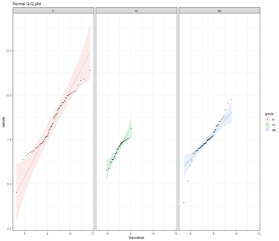 stat_qq_band(alpha=0.15) +stat_qq_line(alpha=0.15) +stat_qq_point(size=0.5) + facet_wrap(~ Species) +labs(title = "Normal Q-Q plot", x = "Theoretical Quantiles", y = "Sample Quantiles")+theme_bw()
